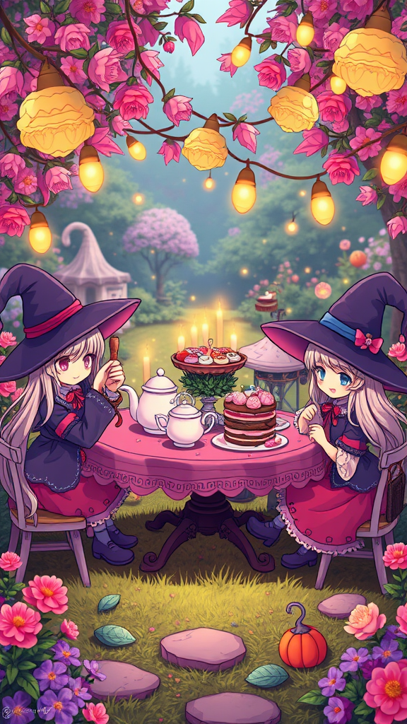 A delightful chibi witch tea party scene, showcasing adorable witches gathered around a charming table laden with whimsical teapots and pastries, set in a vibrant, colorful garden filled with blooming flowers and twinkling lights, capturing a joyful and enchanting atmosphere.