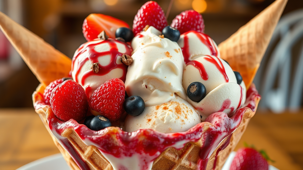 A delightful ice cream sundae served in a crispy waffle cone bowl, brimming with fresh berries and an array of toppings, capturing ultra-high definition detail with vibrant HDR10 colors in a surreal 16K resolution. The scene is playful and exaggerated with whimsical elements like duplicate scoops, imaginative distortions in shape, and quirky features such as elongated cones. The presentation is polished with no visual distractions like blur, artifacts, or out-of-focus elements, ensuring a clean and immersive viewing experience.