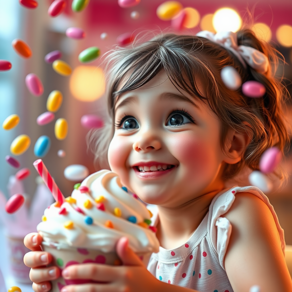 A delightful, joyful girl with a beaming smile enjoying a sundae, surrounded by a whimsical flurry of colorful candies in the air, reminiscent of Pixar's enchanting style. The scene is illuminated with cinematic lighting, capturing the magic and wonder. It feels like a joyful celebration of magic and youthful innocence, rendered in stunning 8k quality that evokes a sense of love and happiness.