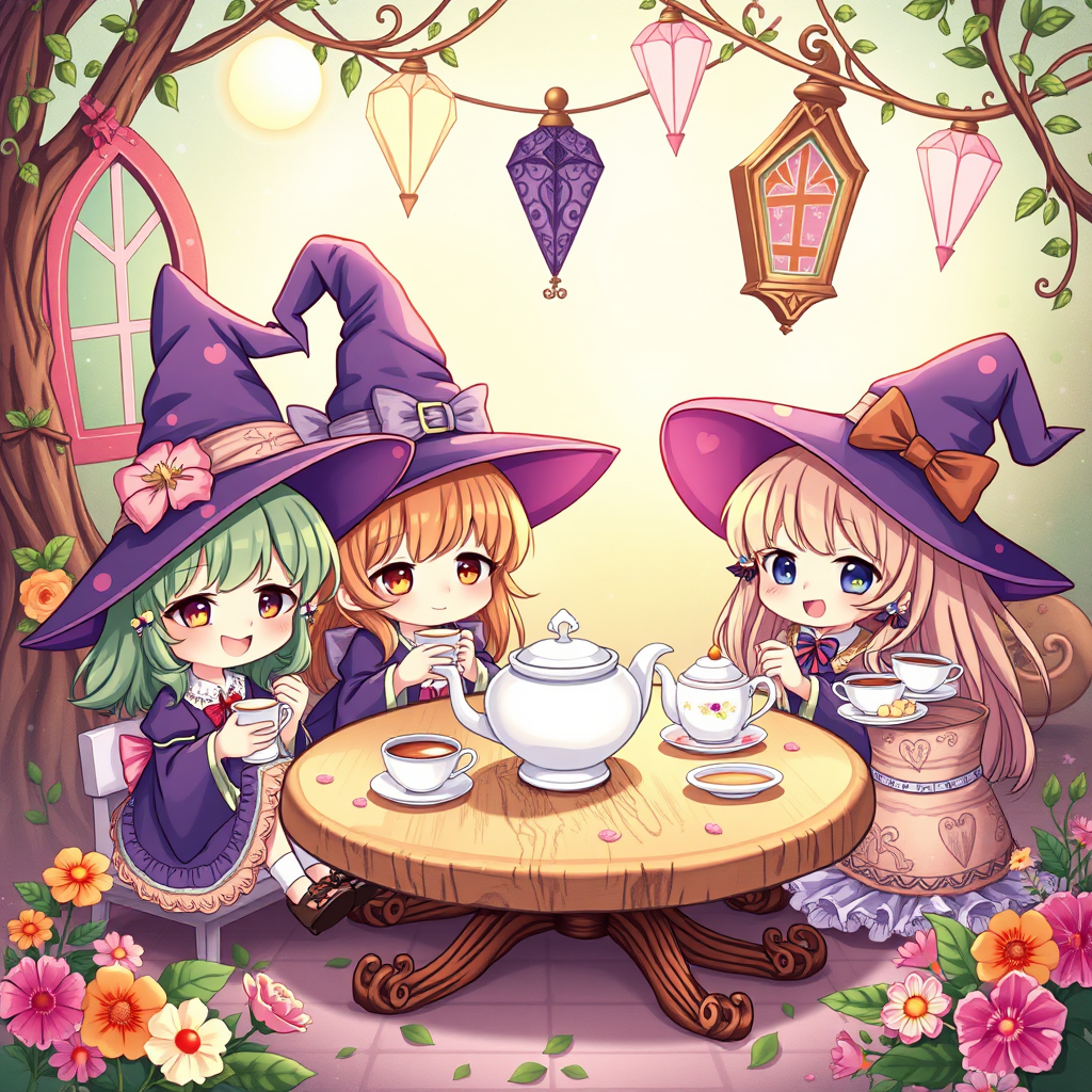 A delightful masterpiece showcasing a chibi witch tea party, exuding cuteness and happiness with vibrant, colorful details, and an enchanting atmosphere.