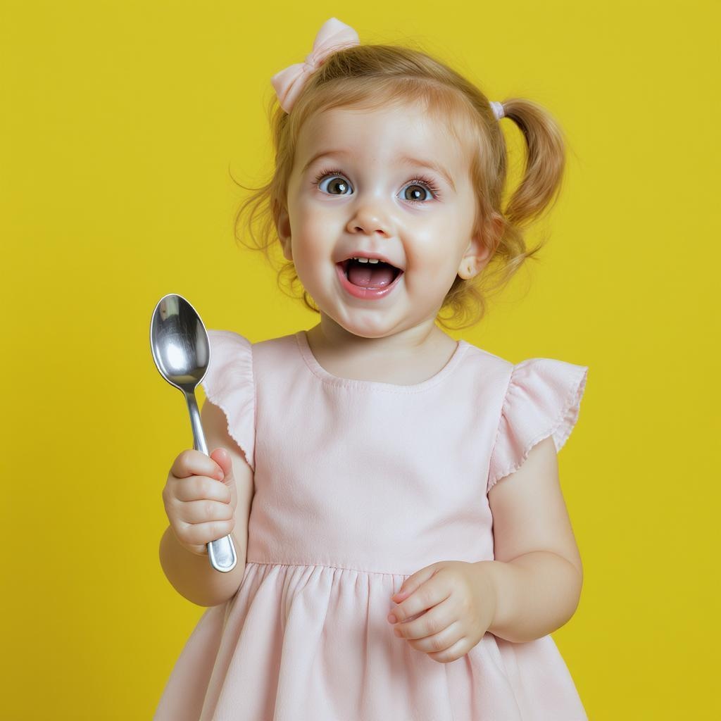 A delightful portrait of a charming 3-year-old British girl in a soft pastel dress, holding a spoon on a vibrant yellow background, her face lit up with an expression of wonder and joy, captured in a professional studio setting.