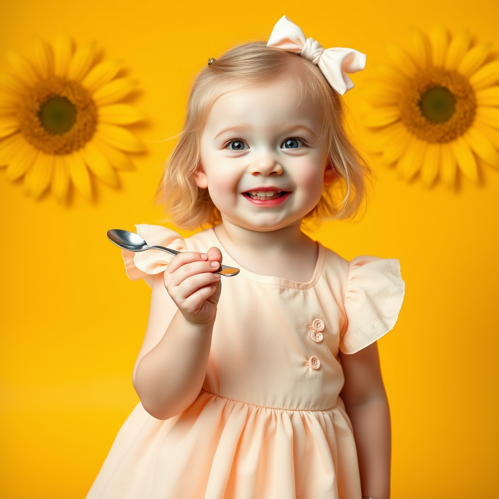 A delightful portrait photograph of an adorable 3-year-old British girl in a soft pastel-colored dress, playfully holding a spoon on a vibrant sunflower yellow backdrop, capturing her joyful and curious facial expression in a professional studio setting.
