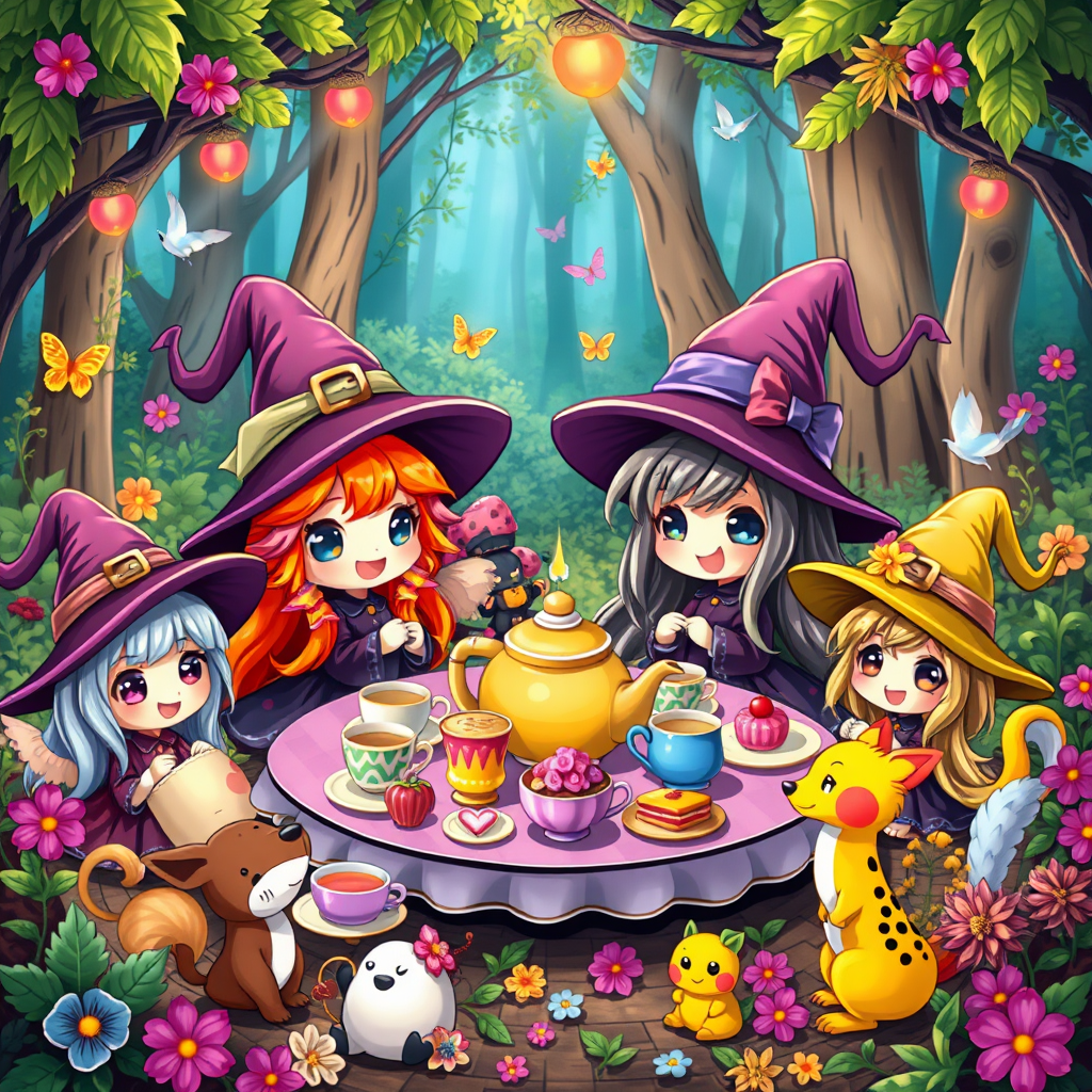 A delightful scene featuring a chibi witch tea party, bursting with vibrant colors and overflowing with joy. The atmosphere is playful and charming, with characters exuding happiness in their whimsical setting. The tea party is set amid a magical forest, where tiny witches with big, expressive eyes and joyful smiles gather around a table filled with an array of vividly colorful teacups, teapots, and delectable treats. The surrounding environment is alive with enchantment, as cheerful woodland creatures join in the celebration, adding to the enchanting and lively masterpiece.