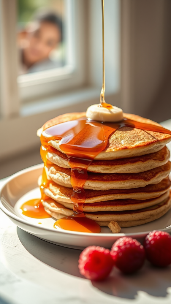 A delightful stack of golden-brown pancakes sits majestically on a pristine white plate, generously drizzled with rich, amber maple syrup that glistens as it cascades down the sides, wisps of steam rise gently from the pancakes, evoking warmth and freshness. Next to the stack, a sleek cup of perfectly frothy cappuccino emits its own faint aroma, complementing the breakfast scene. Two plump, ripe berries rest enticingly on the plate's edge, adding a pop of color. Sunlight filters in, casting gentle glares and enhancing the professional color grading. The setting boasts soft shadows and minimal contrast, capturing every detail in clean, sharp focus. The food photography embraces a captivating bokeh effect in the background, with a hyper-realistic touch and a bath of warm, soft light reminiscent of a peaceful morning, utilizing an f-stop of 2.0 for a dreamy blurriness, all in a vertical 9:16 aspect ratio.