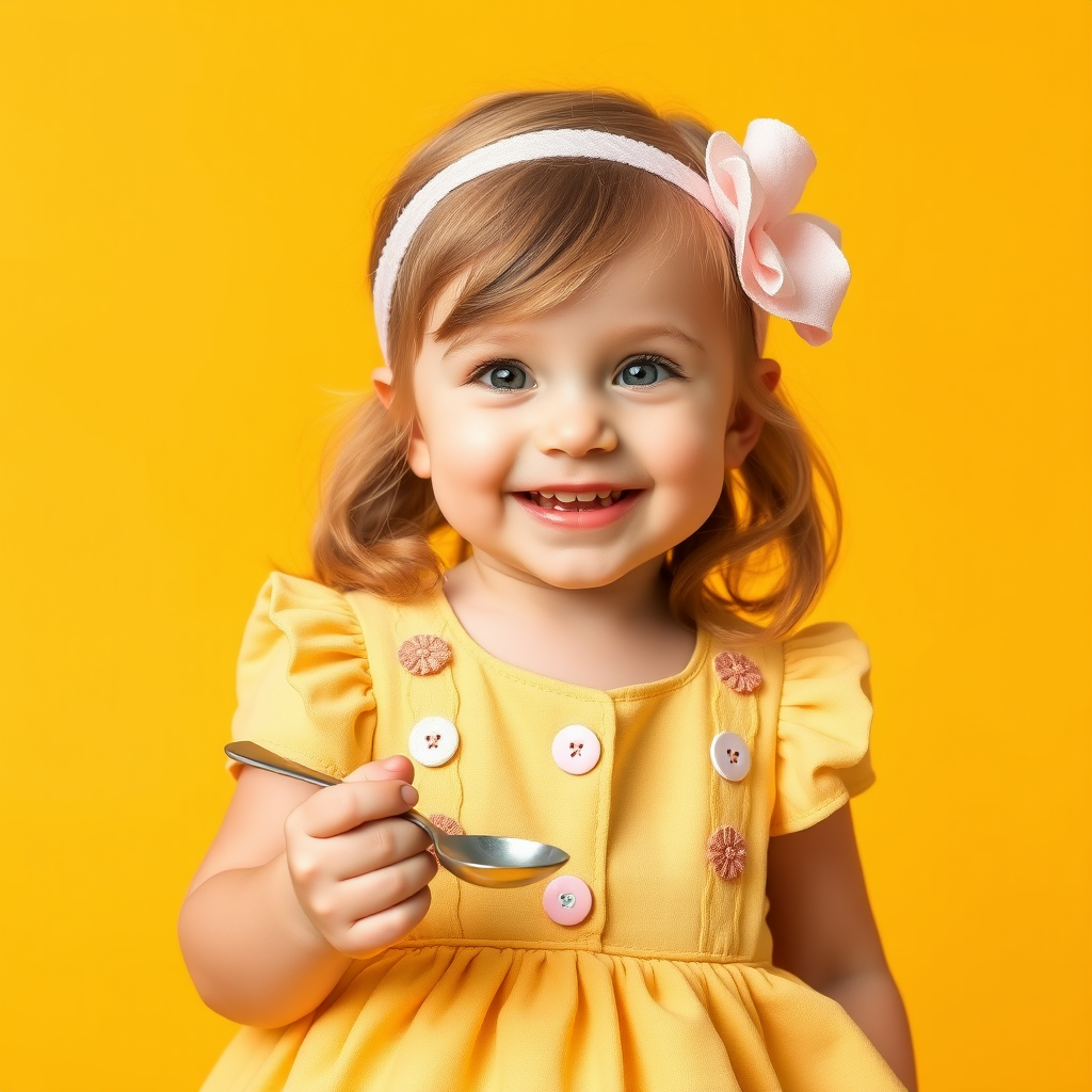 A delightful studio photograph of an adorable 3-year-old British girl dressed in a charming pastel ensemble, grasping a spoon against a vibrant yellow backdrop, her face lit up with a playful and curious expression, capturing the innocence and joy of childhood.