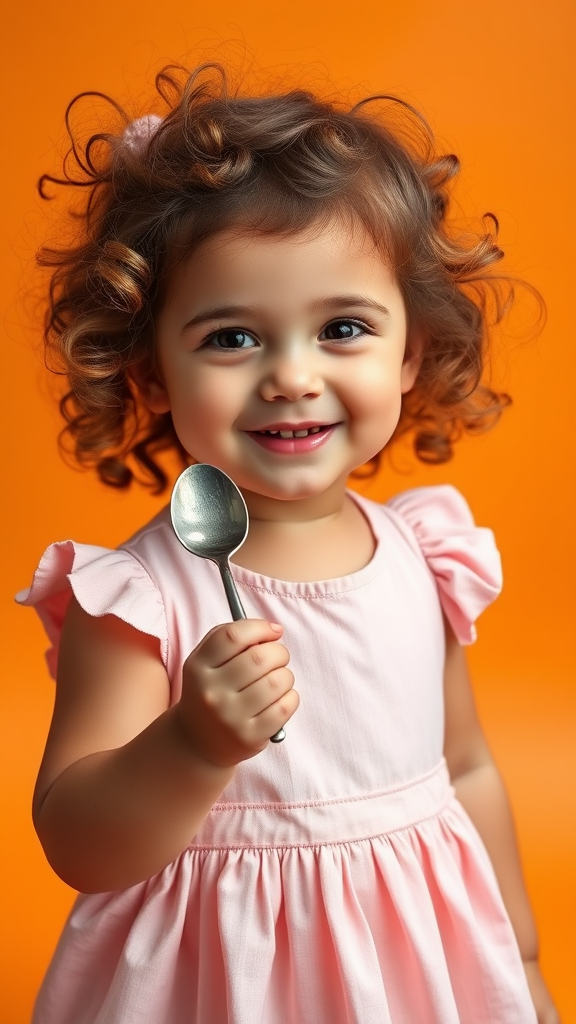 A delightful studio portrait of an adorable 3-year-old British girl with curly hair, dressed in a charming pastel dress, holding a spoon against a bright orange backdrop, her face lighting up with an expression of pure joy and curiosity.