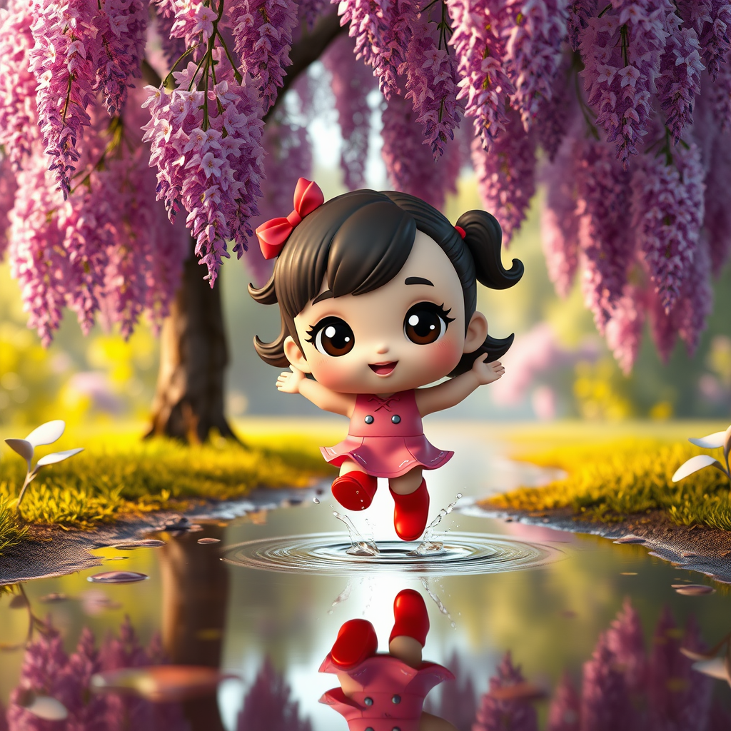 A delightfully whimsical 3D character design of an adorable chibi girl doll gleefully jumping in a puddle, set amidst breathtakingly beautiful scenery under a lush wisteria tree. She dons vibrant red rain boots and sports oversized, sparkling eyes that captivate with their charm. This award-worthy scene is crafted in a hypermaximalist style using octane render to achieve stunning detail. The atmosphere is enhanced by ethereal volumetric lighting, casting a magical glow that complements the enchanting surroundings.
