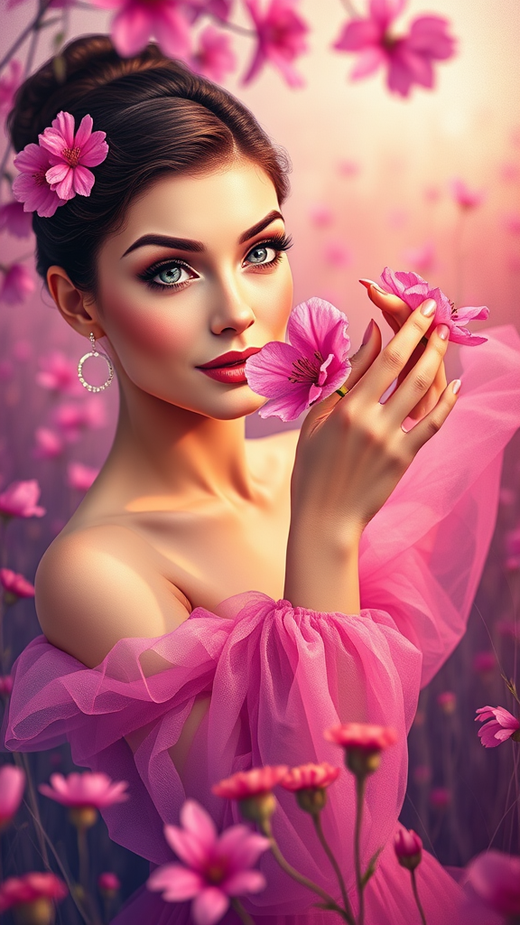 A depiction of a captivating woman embraced by the spirit of Audrey Hepburn, her enchanting eyes and graceful hands cradling a vivid blossom. She twirls in a meadow, a vision of elegance, enveloped in a Multibrot-inspired ambiance. The scene is resplendent with lush colors, predominantly pink and purple hues, capturing a focused portrait of vibrant charm. Illustrated with a touch of whimsy, bringing to life the artistic essence reminiscent of Tracie Grimwood.