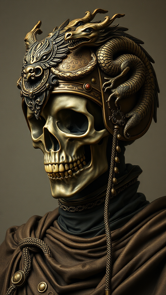 A depiction of a figure adorned with an intricately designed skull helmet, reminiscent of Pinturicchio's style, infused with dragon motifs and lavish detailing. The composition presents a grand portrait, demonstrating mastery in light and dark bronze hues with exquisite engraved line-work. Inspired by Jessie Arms Botke, the scene captures the grace of her artistry with subtle creative variations while retaining the essence of ornate craftsmanship.