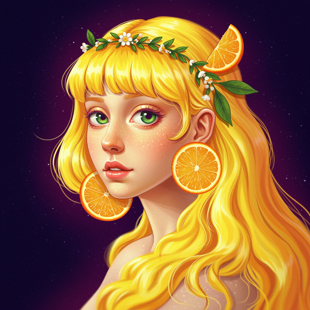 A depiction of a goddess inspired by "Girl with a Pearl Earring," illustrated in an anime-inspired style and infused with an ultraviolet color scheme. The artwork is rich in intricate details, achieving a macro lens effect that draws from the artistic nuances of Johannes Vermeer. The goddess, exuding the elegance of citrus fruits, is enveloped in a vibrant yellow hue. This portrayal seamlessly blends anime aesthetics with Vermeer's classical influence, resulting in a visually captivating and distinct representation of the goddess. The digital painting is rendered in high-quality resolution using Adobe Photoshop, utilizing manual focus for heightened detail.