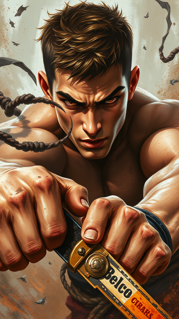 A depiction of a muscular young man with short brown hair and piercing, intense eyes, exuding the presence of a seasoned warrior. His rugged hands show signs of wear, and his face and body bear the scars and marks of numerous battles. Posed dynamically in the heat of a fierce confrontation, the image captures him in a moment of intense action. Inspired by the style of Prokoko, the artwork features bold, expressive brushstrokes and vibrant colors that bring the scene to life. The background, swirling with chaotic energy, adds to the drama and intensity of the battle.