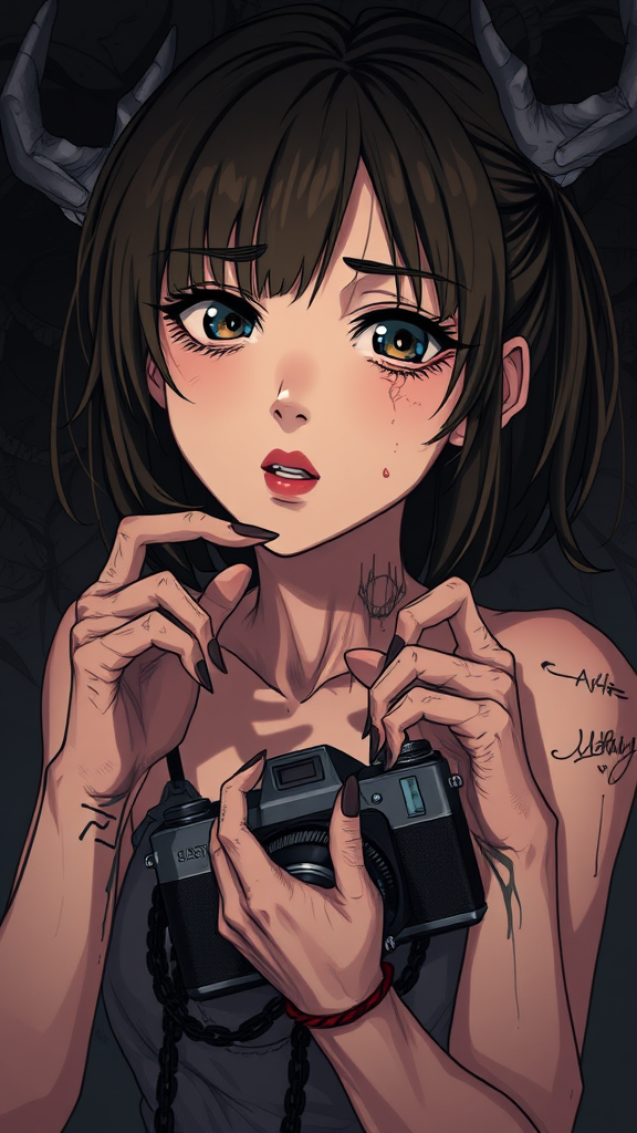 A depiction of a self-obsessed young woman in an Eden-like setting, her expression intense and seductive, captured in an anime-influenced comic style. The background is shadowy and the colors are subdued, creating a digital artwork with intricate details. However, the image is marred with flaws such as low resolution and noticeable jpeg artifacts, with elements that appear duplicated, distorted, or grotesque. The girl's hands and face are crudely drawn, exhibiting mutations and deformities, with abnormal and disfigured anatomy. Features like an elongated neck, malformed limbs, and uncanny proportions add to the unsettling ambiance. A camera, along with random elements like signatures and watermarks, are awkwardly inserted, adding to the chaotic composition.