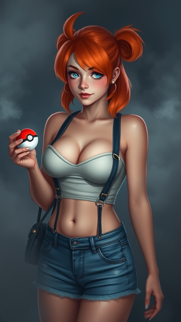 A depiction of a young woman resembling Misty from Pokémon, holding a Pokéball, surrounded by a mysterious fog. She wears low-waisted jean shorts and a snug tank top with suspenders, accentuating her busty figure. Her vibrant orange hair is styled in a playful manner, complementing her lively appearance.