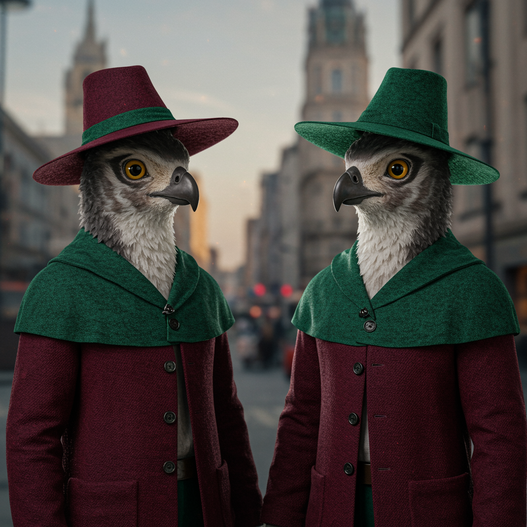 A depiction of two individuals adorned in cloth hats and robes, resembling realistic animal portraits, designed with the sophistication of Unreal Engine and infused with a neo-renaissance flair. The color palette is enriched with maroon and emerald hues, featuring avian-themed elements. Set against the backdrop of a bustling city, these charming characters exude an aura of intrigue and elegance, their attire subtly reflecting the dynamics of urban life intertwined with the gracefulness of bird-like features.