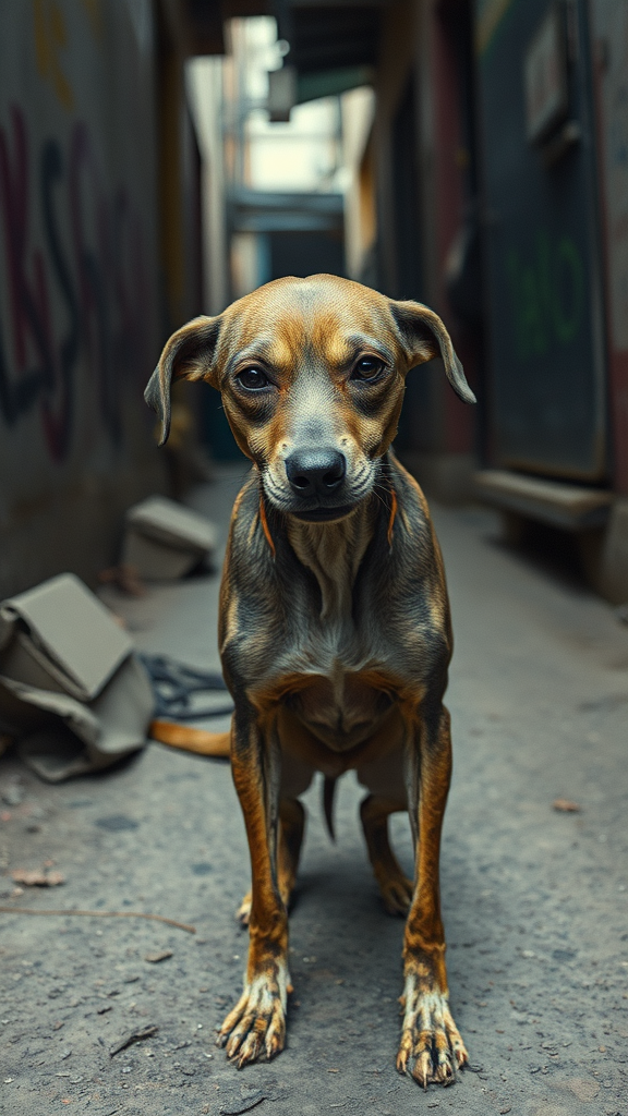 A deserted dog, emaciated, bedraggled, skeletal, with a forlorn expression, unwell, situated on a grimy Bangkok alleyway, its full body visible, gazing directly at the lens, gentle illumination, captured on Agfa Vista 200 film, frontal perspective, 4k resolution, with an artistic flair of impressionism, version 5.