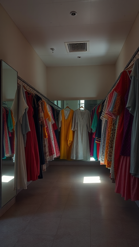 A deserted dressing room with an array of colorful costumes hanging neatly, mirrors reflecting the quiet ambiance and a soft light casting gentle shadows across the room, creating an atmosphere of anticipation for the stories yet to unfold.