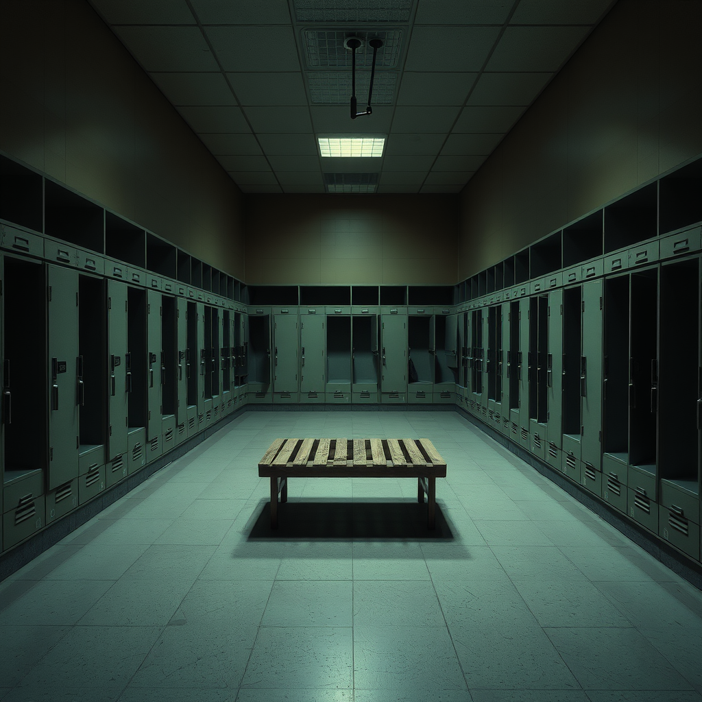 A deserted locker room with rows of open lockers, dim lighting casting soft shadows, and a solitary bench at the center, echoing silence.
