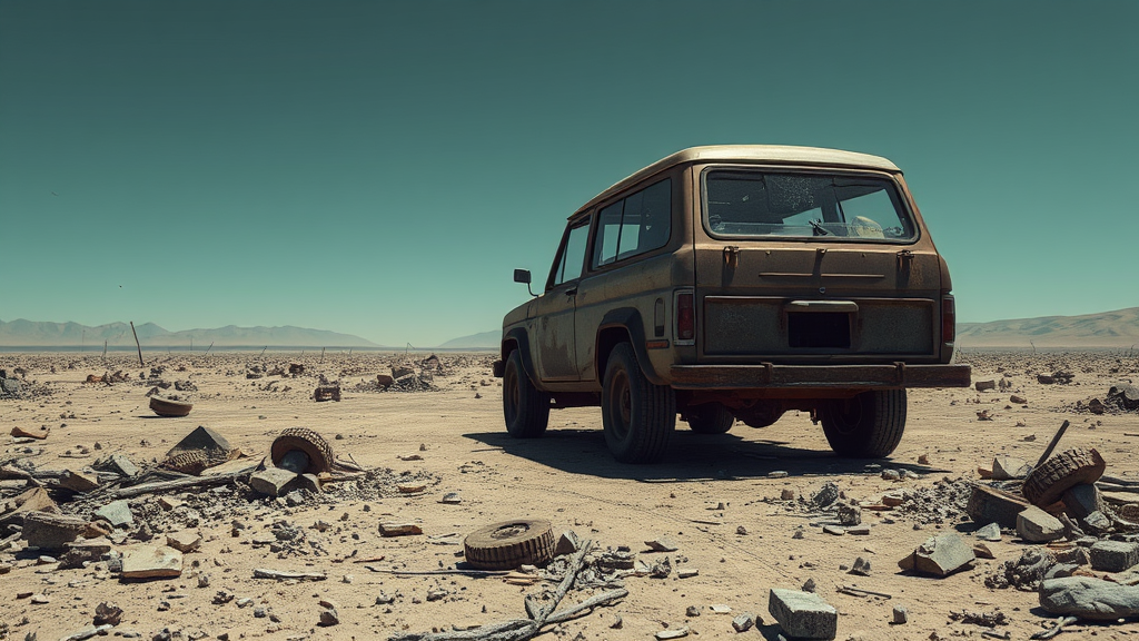 A desolate and barren landscape stretches out, scattered with rubble and debris. In the shadows, an old vehicle looms, its metal exterior battered and rusted from years of abandonment. The tires are deflated, the windshield shattered. The scene suggests neglect and decay, captured in low-resolution CGI, with imperfections like jpeg artifacts and blurred details adding to the sense of deterioration. Disjointed and distorted shapes are scattered around, creating an unsettling and unrefined image.