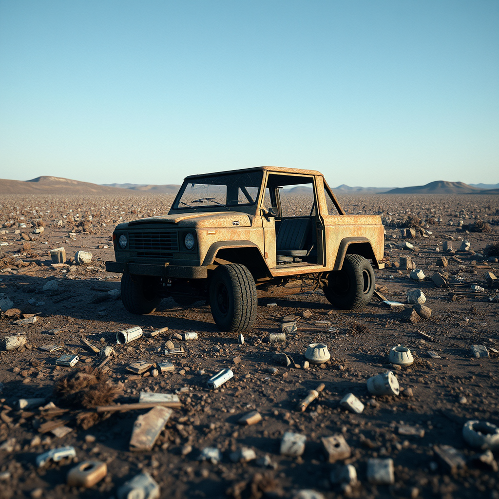 A desolate and barren landscape stretches out, with rubble and debris scattered across the ground. In the shadows, a vehicle stands, its metal exterior battered and rusted from long years of abandonment. The tires lie flat, and the windshield is shattered. CGI render 3D, low resolution, artifacts present. The scene is chaotic, with elements like missing parts and distorted shapes, accompanied by visual imperfections such as blurriness and poor anatomy. The artwork carries a rough and grotesque aesthetic, with a sense of neglect and decay permeating the scene.
