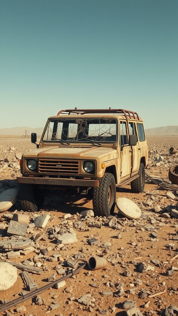 A desolate and barren landscape strewn with rubble and debris, a vehicle lurks in the shadows, its metal frame battered and rusted from neglect. The tires are deflated, and the windshield is a web of shattered glass. The scene is rendered in CGI, echoing a sense of abandonment and decay.