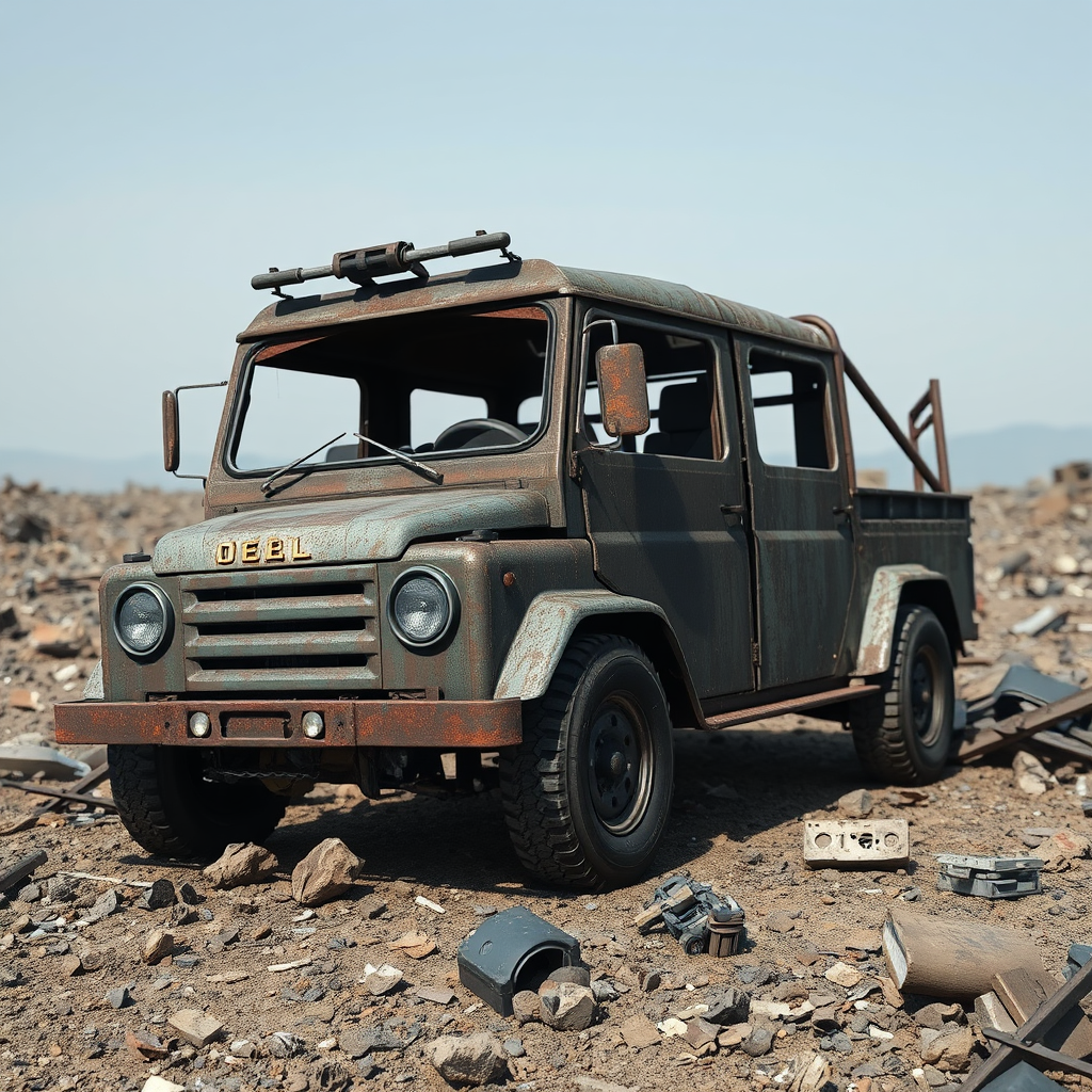 A desolate and barren landscape strewn with rubble and debris. In the shadows, a vehicle looms with its metal exterior scarred and rusted from years of abandonment. The tires are deflated, and the windshield shattered. CGI render of a low-resolution scene marred by text errors, missing and extra digits, cropped frames, JPEG artifacts, and poor anatomy. The vehicle looks disfigured and misshaped, with blurry and fuzzy details. Despite its ugly appearance, it adds to the grim atmosphere, as if it's grossly out of place in this wasteland.