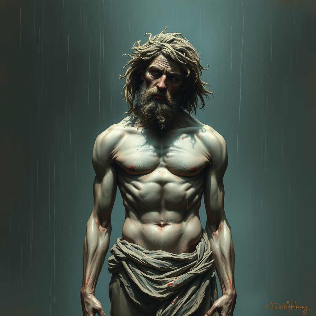 A despairing Greek god, portrayed as a digital painting with a haunting impact on the psyche, set against a dark, rainy backdrop with muted colors. The composition is brutal and epic, with expressionistic brushstrokes that evoke deep emotional resonance. The figure is intricately rendered yet intentionally flawed, exhibiting poor anatomy and proportions, with features like poorly drawn hands, a disfigured face, and malformed limbs. The god's form is unsettlingly distorted, with extra and missing limbs, a long neck, and blurred details, creating a low-quality, artifact-ridden appearance, reminiscent of a degraded jpeg image. The image leaves an unforgettable, morbid impression, avoiding traditional elements like watermarks or logos while conveying a sense of eerie, deformed beauty.