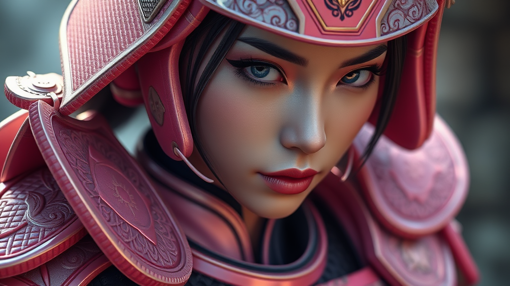 A detailed 3D render capturing a close-up view of a woman in pink samurai armor, showcasing intricate patterns and textures on the armor plates, her expression a mix of determination and serenity, the gleam of the armor reflecting soft light, set against a subtle backdrop that suggests a mystical environment, the scene immersing the viewer in a fusion of tradition and fantasy.