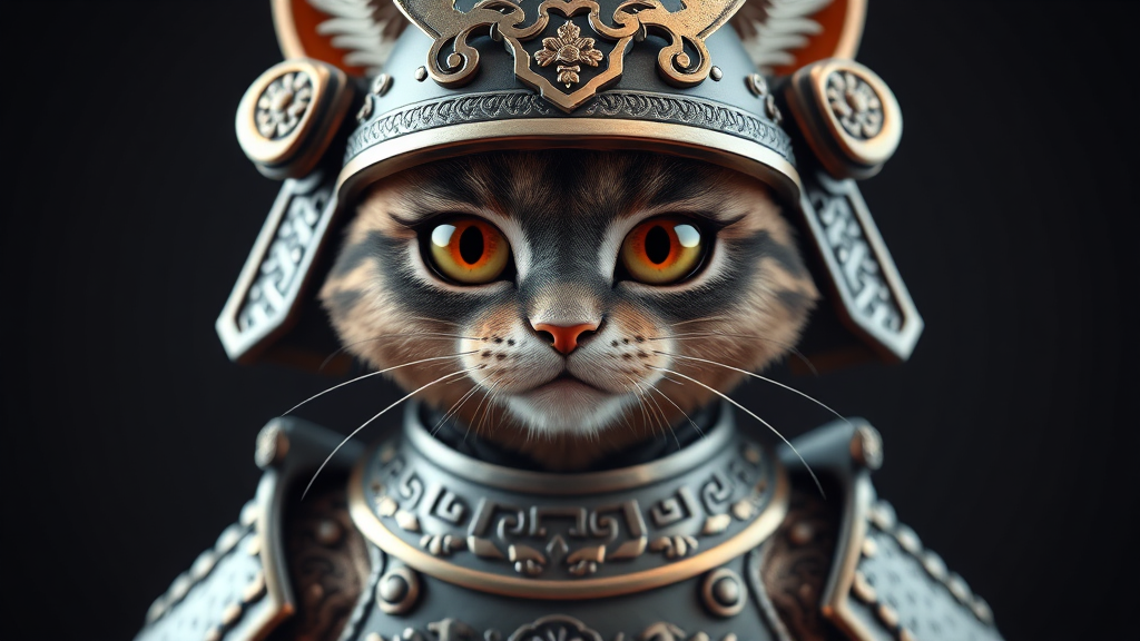 A detailed 3D render of a feline warrior in a traditional samurai armor, featuring intricate engravings and a polished finish, with the cat's expressive eyes visible through the helmet's slits. The scene captures the essence of both elegance and strength, with a playful twist as the armor's colors subtly reflect the soft fur underneath, every detail contributing to the character's brave yet adorable demeanor.