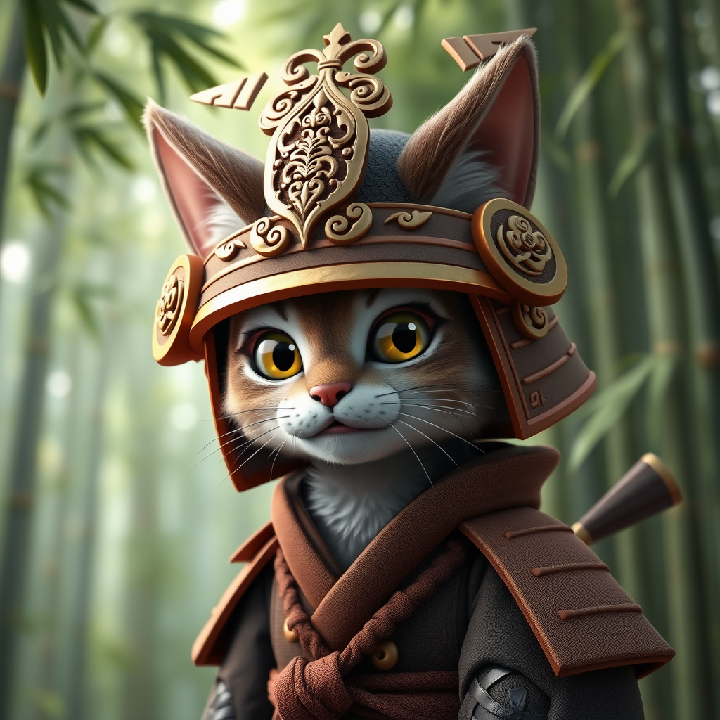 A detailed 3D render of a whimsical samurai cat wearing an ornate, intricately designed helmet, with soft fur textures and expressive, bright eyes; the backdrop is a serene bamboo forest, adding a touch of adventure to the portrait while highlighting the cat's playful yet noble demeanor.