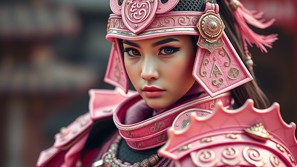 A detailed 3D render of a woman wearing elaborate pink samurai armor, capturing a close-up angle that emphasizes the intricate designs and textures of her protective gear; the scene is styled in a high-resolution, raw aesthetic, highlighting the gleaming metalwork and vibrant hues of pink with harmonious accents, set against a blurred background that suggests a sense of motion and readiness.