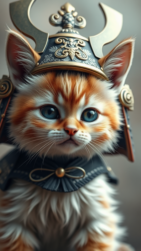 A detailed 3D render of an adorable cat wearing an intricately designed samurai helmet, featuring fluffy fur textures and an expressive face, set against a soft-focus background that highlights the gleaming metalwork and delicate engravings on the helmet, capturing a perfect blend of cuteness and fierceness in a captivating portrait.