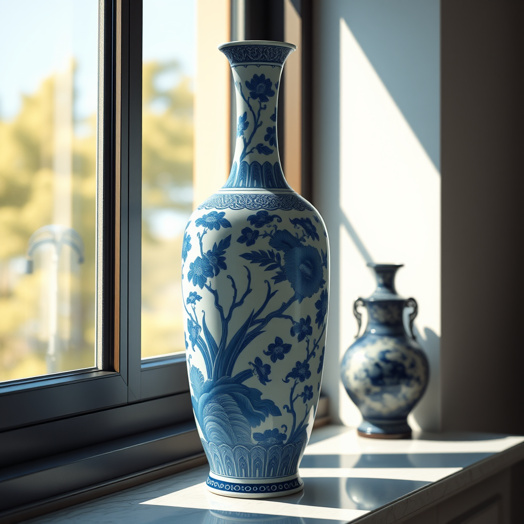 A detailed 3D render of an intricately designed Chinese blue and white porcelain vase with a long neck, placed on a sunlit window sill, capturing the authentic craftsmanship and elegance. The piece is artistically inspired by Christian Hilfgott Brand, celebrated on cg society, and embodies the precisionism movement with a touch of modern artistry. The scene is illuminated by soft studio lighting, enhancing the vase's delicate features and textures, emulating the richness and depth of provia film. The visual composition maintains a cinematic 16:9 aspect ratio, offering a serene and picturesque view.