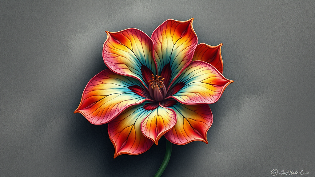 A detailed airbrush painting of a vibrant, biomorphic flower on a textured gray background, in the style of Earnst Haeckel, infused with cloisonnism's bold outlines and vivid colors, featuring high detail that captivates with its intricate patterns and natural elegance, trending on artistic platforms akin to zbrush central, showcasing subtle creative nuances with swirling organic forms and dynamic composition.