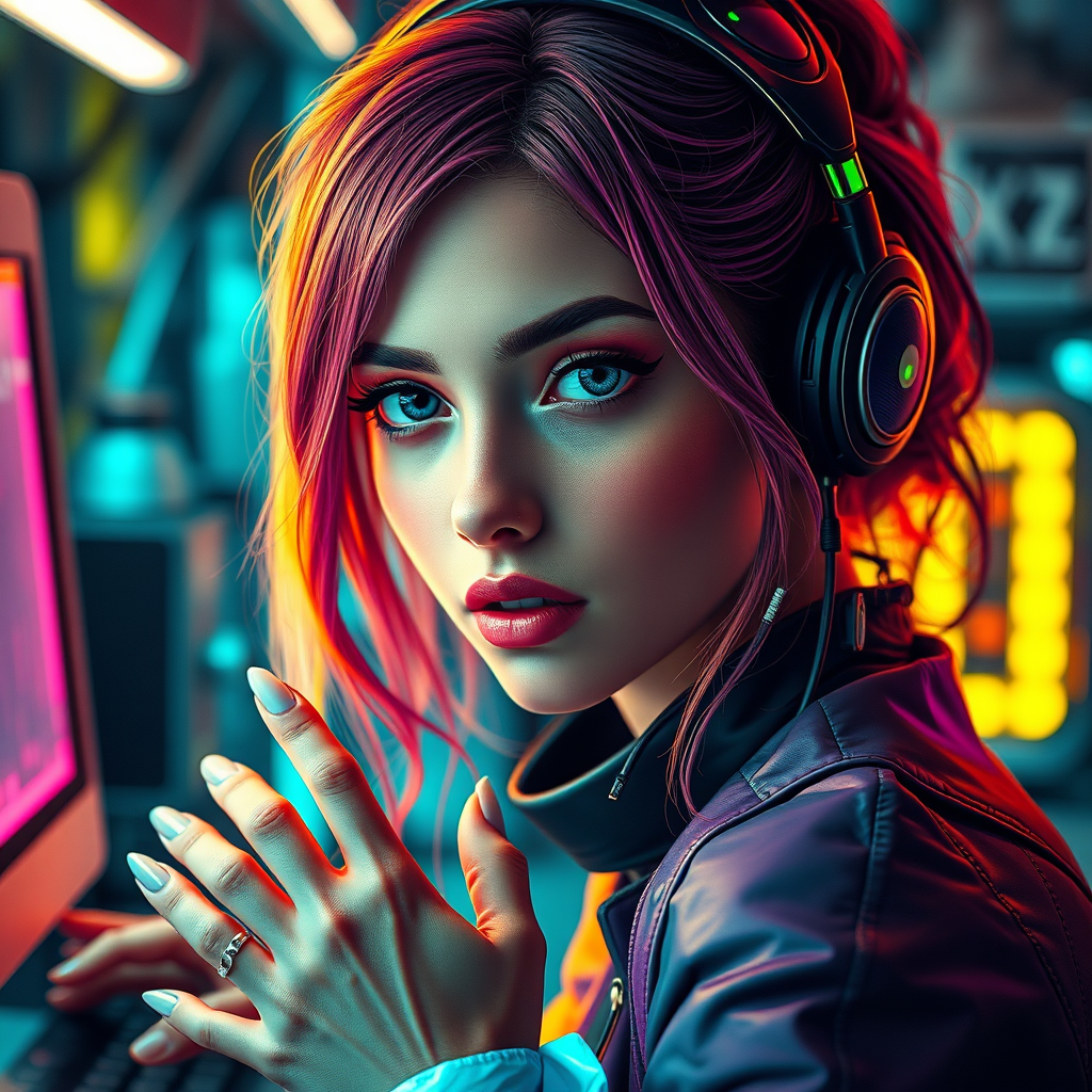 A detailed and mesmerizing portrait of an imaginative female cyberpunk biohacker at her workspace, featuring a striking blend of vibrant neon colors and a volumetric atmosphere. The composition showcases a beautiful face with captivating eyes and elegant hands, rendered in high resolution with stunning precision and intricate details. The scene evokes a futuristic and cinematic aesthetic akin to a digital masterpiece trending on platforms like ArtStation. It's a fusion of sharp focus and comprehensive artistry, reflecting the enchanting allure of a cyberpunk world. The image is devoid of any imperfections such as distortions, text overlays, watermarks, unnatural anatomy, or digital artifacts, ensuring a flawless visual experience.