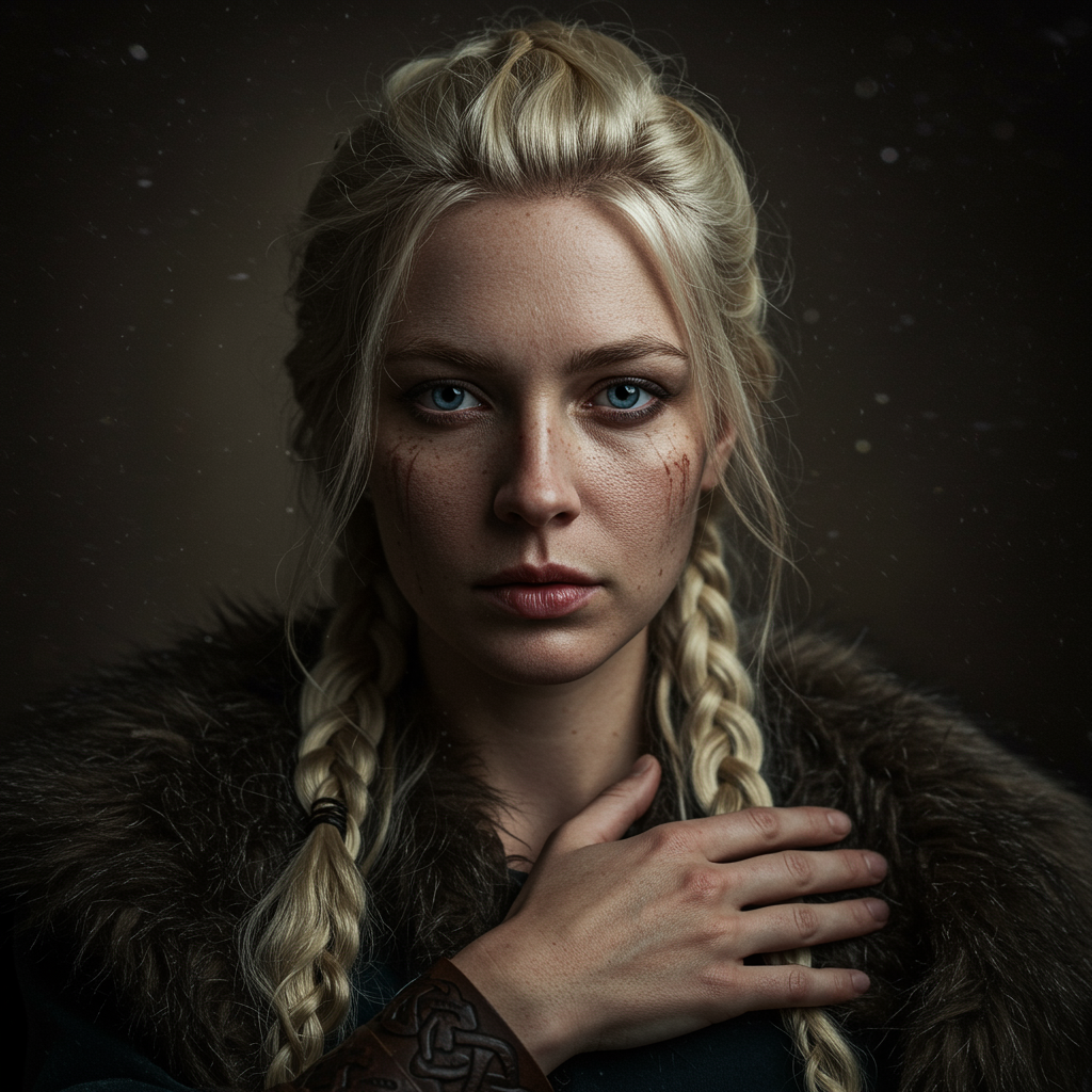 A detailed and realistic portrait of an enchanting modern female Viking characterized by soft natural lighting in a style reminiscent of portrait photography using an 85mm lens. The image showcases magical and dramatic lighting, achieving photo realism with ultra-detailed features in an intimate portrait composition. Captured in a Cinestill 800T low-res aesthetic, incorporating unique textural elements, the portrait focuses on the essence of beauty amidst imperfections. The character is realistic yet embraces authentic flaws such as unexpected anatomy reflections, lending a unique artistic flair. The composition maintains artistic integrity with elements like possible extra or fewer digits, hands slightly out of conventional form, providing an intriguing perspective. Signature effects such as slight cropping, jpeg artifacts, or unexpected textural patterns suggest a piece that's beautifully imperfect.