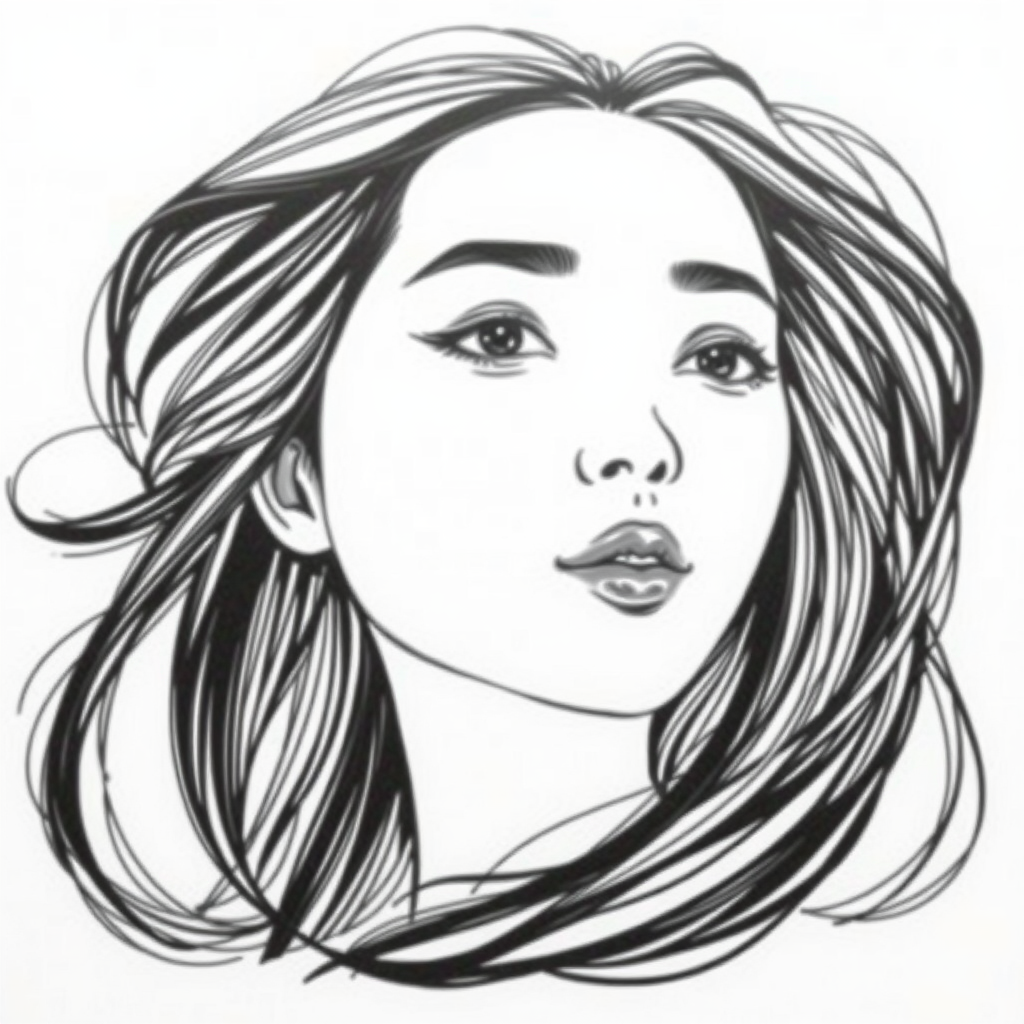 A detailed black and white sketch of a graceful Korean woman with flowing hair, set against a plain white background, capturing a sense of elegance and poise. The style is soft yet intricate, with emphasis on facial features and gentle shading to create depth and realism, while maintaining an artistic essence.