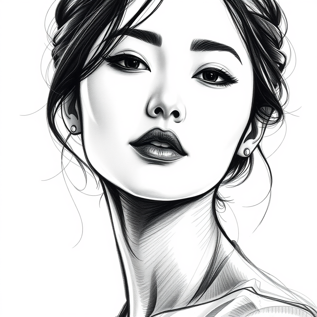 A detailed black and white sketch of an elegant Korean woman against a plain white background, adding an artistic flair with subtle touches of texture and depth, capturing her serene and graceful demeanor with delicate shading and intricate line work to emphasize her features.