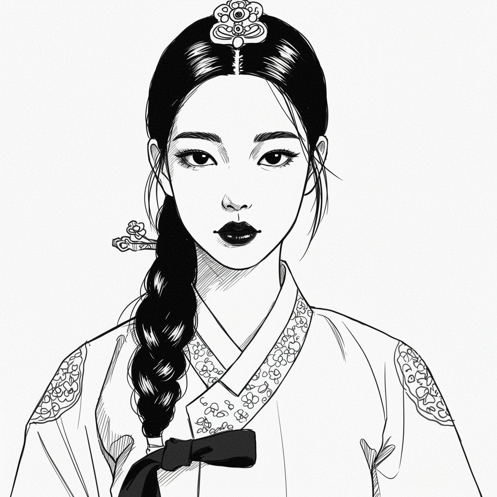A detailed black and white sketch of an elegant Korean woman with striking features, set against a plain white background, showcasing a blend of realism and subtle artistic flair, emphasizing the natural grace and beauty of traditional Korean aesthetics.
