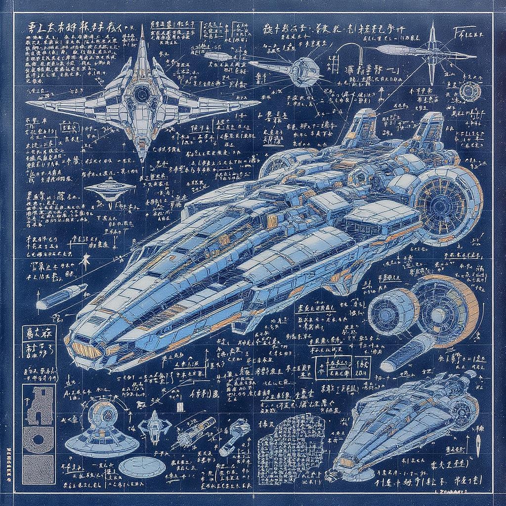 A detailed blueprint sketch of a colossal futuristic sci-fi spacecraft, featuring intricate warp engines, mathematical formulas, and annotations scattered throughout. The design is divided into schematics by parts, subtly influenced by the golden ratio, imbued with fictitious yet believable details. The visual style is inspired by the trending aesthetic on Pixiv Fanbox. The color palette is rich and textured, reminiscent of acrylic palette knife techniques. It draws on the atmospheric storytelling style of Makoto Shinkai, the enchanting visuals of Studio Ghibli, and the epic fantasy elements of Genshin Impact, fused with the mid-century modern stylings of James Gilleard. The artwork bears the surreal and whimsical touch of Chiho Aoshima and is enhanced by the dramatic, detailed flair of Greg Rutkowski.