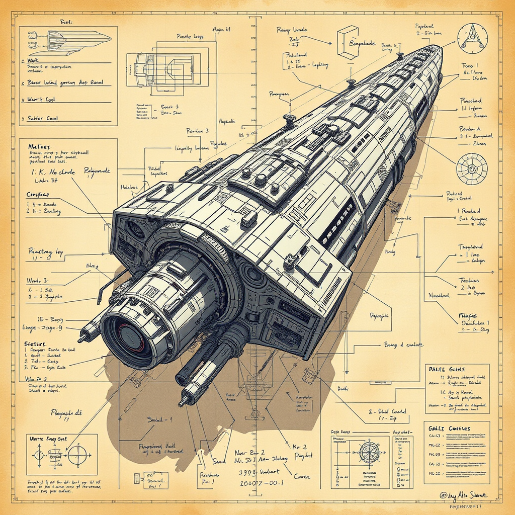 A detailed blueprint sketch of a massive futuristic sci-fi spacecraft with intricate warp engines, adorned with complex formulas and annotations, showcasing a schematic breakdown of various parts. The design respects the golden ratio with imaginative fake details. The aesthetic resonates with a trending Pixiv Fanbox appeal, utilizing an acrylic palette knife style blended with influences from Makoto Shinkai, Studio Ghibli, and Genshin Impact. The visual elements reflect the artistry of James Gilleard, Greg Rutkowski, and Chiho Aoshima, merging vibrant, dreamlike qualities with meticulously crafted mechanical elements in a cohesive visionary masterpiece.