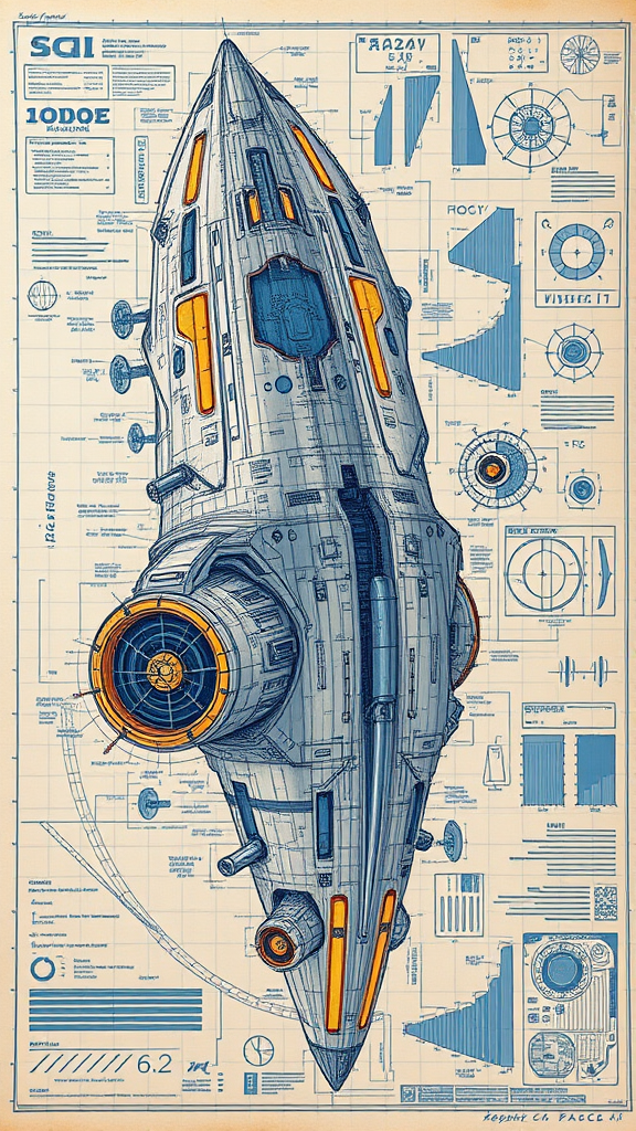 A detailed blueprint sketch of an enormous, futuristic sci-fi spacecraft featuring intricate warp engines, adorned with complex formulas and annotations. The schematic is meticulously divided into parts, emphasizing a harmonious design guided by the golden ratio. It includes imaginative fake details to enhance its otherworldly appearance. The artwork is styled with an acrylic palette knife technique, reminiscent of the vibrant and ethereal aesthetics of Makoto Shinkai, the whimsy of Studio Ghibli, and the enchanting landscapes of Genshin Impact, all infused with the bold illustration style of James Gilleard, the dreamlike quality of Greg Rutkowski, and the vivid imagination of Chiho Aoshima. The composition experiments with light and shadow to evoke a sense of wonder and innovation, creating a visually stunning and immersive piece that captures the essence of futuristic exploration.