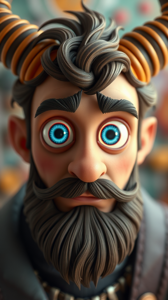 A detailed character portrait of a man with horns and a beard, inspired by the work of a senior character artist and polycount contest winner, rendered in Unreal Engine 5. Featuring bright, clear, neon Pixar-like eyes, capturing a whimsical and playful essence reminiscent of Nomeradona's playground. The character has cute, big circular reflective eyes, embodying a Pixar render style with smooth cinematic quality. The portrayal includes intricate and abstract details, with a cartoonish and animated toy-like appearance. The figure is framed in a 3D setting, incorporating elements of disfigurement and abstract design. The scene is filled with vibrant and unusual colors, intentionally creating a sense of oddity and experimentation, featuring blurred areas and a low-resolution aesthetic to emphasize the playful and creative imperfections of animation, reminiscent of a sketchbook filled with pencil and pen drawings.