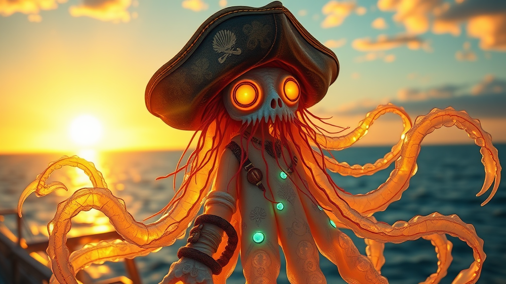 A detailed character portrait of an anthropomorphic jellyfish pirate, with translucent tentacles flowing elegantly, posed in a dynamic stance. The scene is backlit by a setting sun casting golden light rays through the jellyfish's ethereal form, illuminating its vibrant colors and intricate textures. The pirate's attire is adorned with nautical elements, such as shells and seaweed, and features a tricorn hat perched atop its bell-shaped head. Bioluminescent markings on its body glow softly, adding a mystical touch. The background hints at a vast ocean horizon, setting a sense of adventure and mystery. This creative artwork is highly detailed and visually captivating.