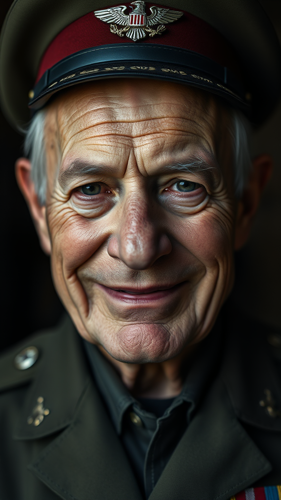 A detailed cinematic close-up portrait of an 85-year-old distinguished and decorated military general, featuring a clean-shaven face with a gentle, warm smile directed at the camera. This epic shot captures his stoic aura with intricate detail, set against a moody, dark background that enhances his presence. The image is reminiscent of high-quality 4k film, similar to a classic Kodak photograph, with subtle creative touches that highlight his wisdom and experience.
