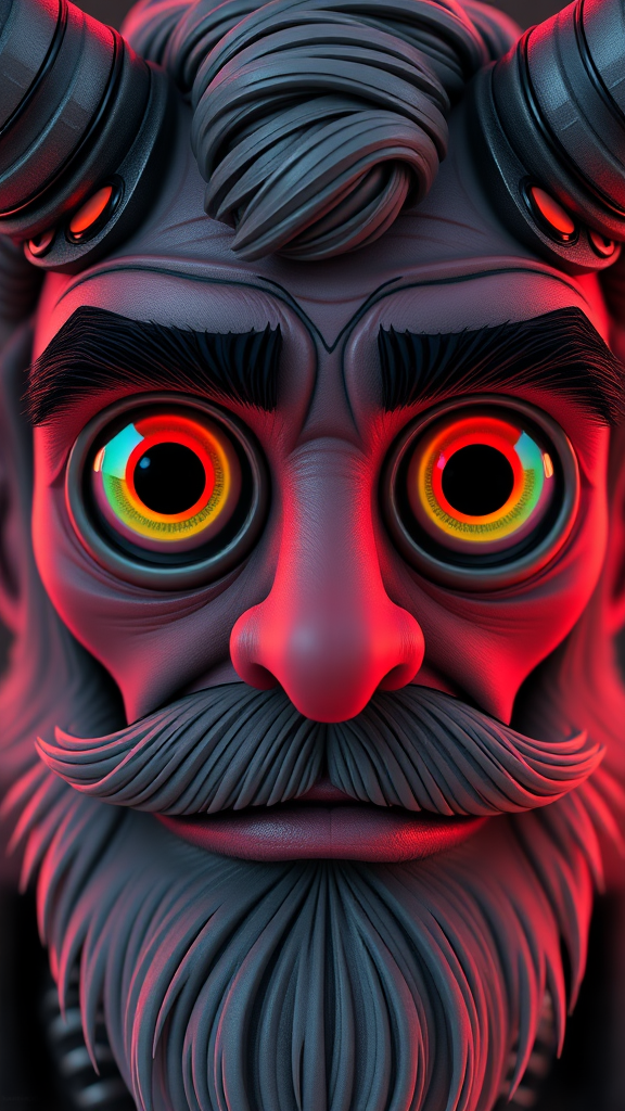 A detailed close-up character portrait of a horned man with a beard, crafted by a senior character artist and polycount contest winner. This computer-generated artwork is rendered in Unreal Engine 5, showcasing bright, clear neon eyes reminiscent of Pixar's style, with a playful twist inspired by Nomeradona's playground themes. The character features large, circular reflective eyes in a smooth, cinematic style, with intricate detailing. The piece is intentionally abstract and cartoon-like, giving it a toy-like, figurative quality. Despite its vibrant, animated essence, the image incorporates elements of intentional imperfection with distorted and surreal anatomy, including disfigurations and extra limbs, set in a black and white palette with weird colors. The work is designed to give an impression of being poorly drawn or low-quality, with blurry, oversaturated aspects, reminiscent of bad quality CGI with a watermark-like feel. Furthermore, it features a close-up framing with elements of pencil and pen art, blending the boundaries between digital and traditional mediums.