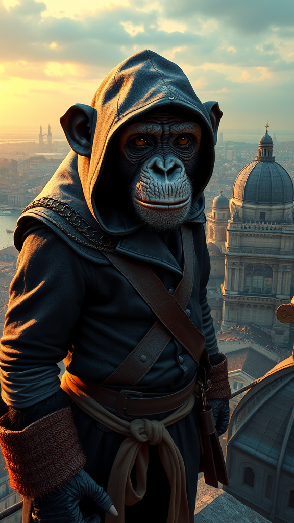 A detailed close-up image of a chimpanzee adorned in assassin attire, standing atop a rooftop with a breathtaking view of ancient Venice sprawling below. The scene is enveloped in a cinematic blend of volumetric lighting and atmospheric haze, highlighting the intricate details of the chimpanzee's outfit and focused expression. This vivid tableau is reminiscent of a scene from a classic epic, with precise lineart capturing the graceful architecture of Venice in the backdrop. The composition exudes vibrant energy and cinematic grandeur, inspired by the artistry of Stefan Gesell, adding a subtle touch of creative whimsy to the majestic setting.