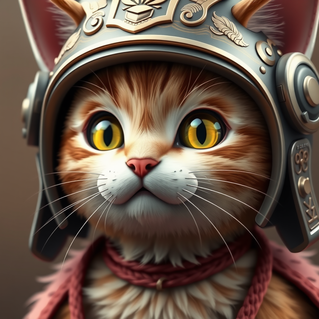 A detailed close-up of a cat with bright, expressive eyes, wearing an intricately designed helmet reflecting a blend of traditional Samurai aesthetics and modern flair; this cute, furry art portrait showcases a 3D render with lifelike textures, capturing the cat's playful yet noble demeanor. The helmet gleams with subtle engravings of cherry blossoms and rolling clouds, adding a touch of fantasy and elegance to the image.
