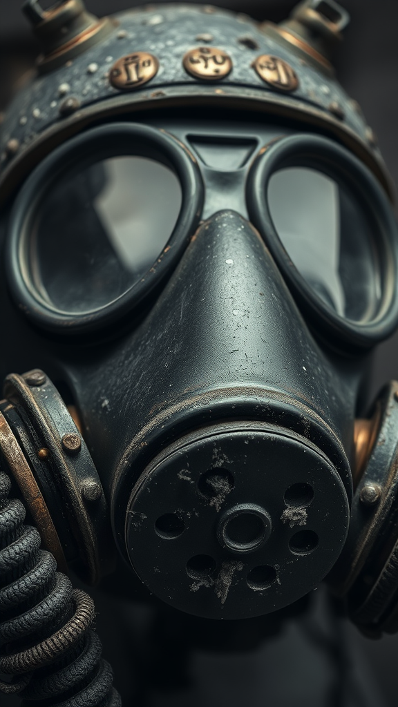 A detailed close-up of a Chernobyl liquidator's gas mask, occupying the entire frame with striking, gritty realism. The mask, an authentic Soviet-era design, features rounded, slightly fogged lenses and robust, dark rubber seals showing signs of wear and tear. Thick, heavy straps wrap around the mask, coated in fine layers of ash and grime, remnants of the reactor's catastrophic fallout. The texture of the mask is marred by tiny cracks and scuffs, telling a silent story of intense use and resilience. Subtle hints of rust peek through the metal components, adding a touch of forlorn history to the scene. The atmosphere envelops the mask in a dim, smoky hue, enhancing its haunting presence.