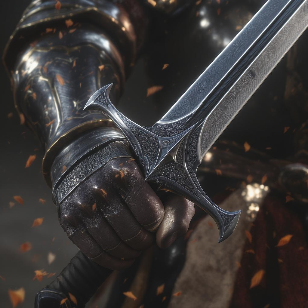 A detailed close-up of a knight gripping a sleek ebony sword with intricate patterns etched along its length, showcasing the mesmerizing reflections and razor-sharp edge of the blade. The metal gleams with fine surface textures and subtle curves, rendered in hyper-realistic detail using advanced rendering techniques. The scene is processed in high definition through an Unreal Engine 5 pipeline, utilizing RTX shaders for visual fidelity. Every detail is highlighted in HDRI, brought to life in ultra-realistic 32K UHD resolution, capturing the essence of realism with creative enhancements to the knight's armor and the ambient surroundings.
