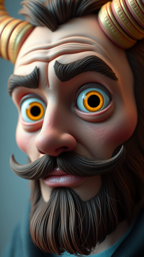 A detailed close-up of a man with horns and a unique beard, rendered as a character portrait by a senior character artist and inspired by a polycount contest winner. Created using Unreal Engine 5, the image showcases bright neon Pixar-style eyes, capturing an animated and toy-like essence. The character features cute, large circular reflective eyes, rendered in a Pixar-like cinematic style with intricate digital artistry. While maintaining a cartoonish and abstract feel, the portrait plays with disproportionate elements like disfigured anatomy, adding extra limbs and a cloned face, creating an unusual, whimsical appearance. The overall composition includes a blend of vibrant colors and blurry details reminiscent of low-resolution or poor-quality renders, complete with distorted and oversaturated visuals. Elements like watermarks or sparse text may appear, imitating a confused or experimental artistic process. The figure is cleverly framed as part of a CGI 3D canvas, echoing a blend of both polished and chaotic artistic influences.